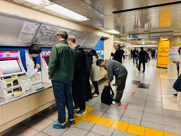 There is no nation as law-abiding as the Japanese. Whereas in the Netherlands the biggest crowd barriers won't stop anybody from trespassing, in Japan a small piece of string is enough to make everyone go the long way around. We adapt well, but the pressure to take a good panoramic photo is increasing. Japan turns out to be less photogenic than we had hoped. It is either boring everyday buildings or mega-touristy temples. We haven't found anything in between. In a tourist tea garden, we have to make do; there is a nice corner with two old, red, Japanese maples. Between flocks of tourists, I do something our guide has never seen before. He probably doesn't even know it can be done at all... I step over a barrier string that runs along the path 30 cm above the ground and sit down on a boulder in the little garden. Our guide gets so nervous that I immediately feel like a criminal. In the end, this will be the panorama we use for our invitations and exhibition wall. At least our guide flushing with embarrassment was not in vain.