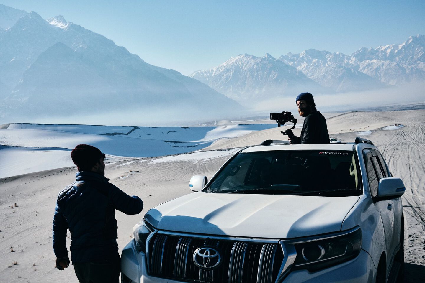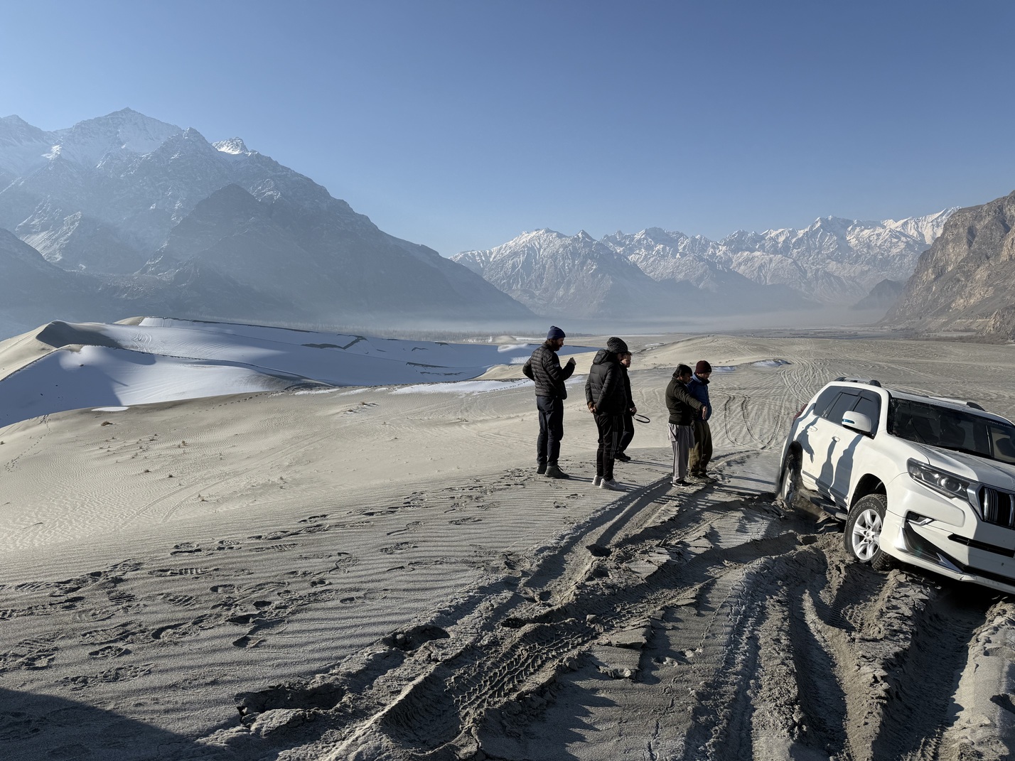 Waiting does not fit into our schedule. The travel agency arranges a van. We set off for a 14-hour drive, which ends up taking 19 hours, straight through the Himalayas and across red marked territory. Should the car break down on the way, we don't even need to call the embassy. They won't come to help us here anyway. Through the Kohistan region, we get an armed escort: a police car in front of us, and two policemen in the back. They look at us sternly, their machine guns at the ready. Our guide shrugs. “Formality.”