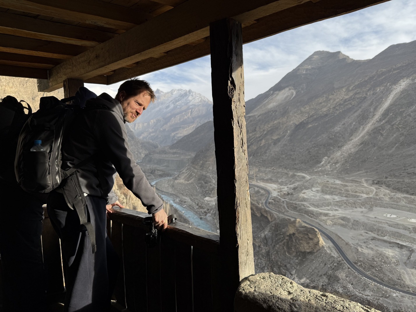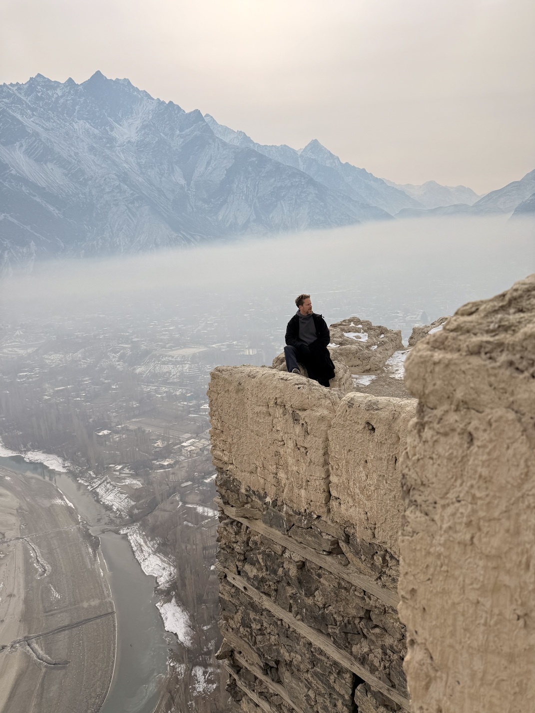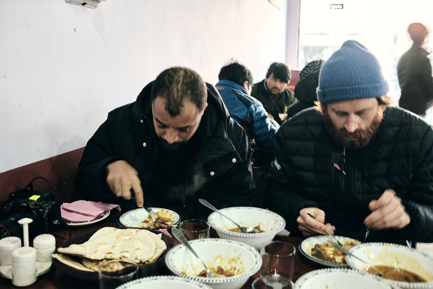 We have been warned: domestic flights to Gilgit are often cancelled due to the unpredictable weather in the Himalayas. We land in Islamabad at five in the morning. The flight to Gilgit is scheduled for eleven o'clock. We spend the six hours in between on a bench in a waiting area with a carpet that is already curling up and coming off. Sleep is out of the question. At least, not for us. A little further, a woman in a burka is happily snoring away.
