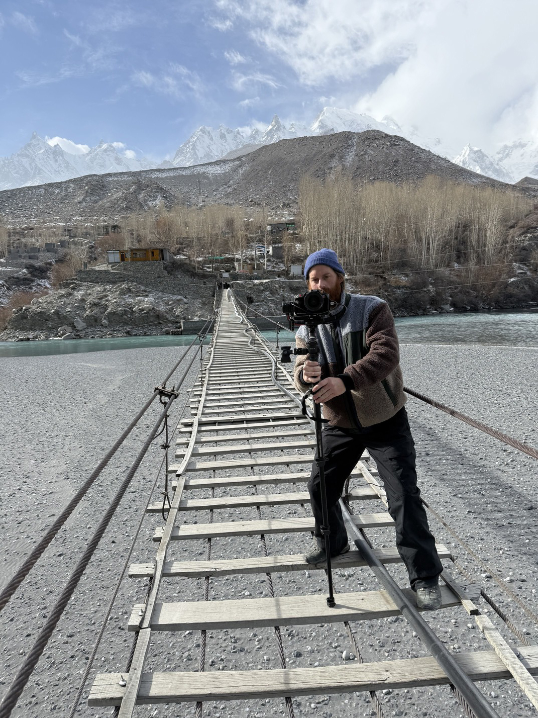 We take photos at a famous suspension bridge. Between every wooden plank is half a metre of open space. A mountain river rages thirty metres below. ‘There's only been one death this year,’ someone reassures us. For my anxious mum, I film myself walking across the bridge without holding on to anything.