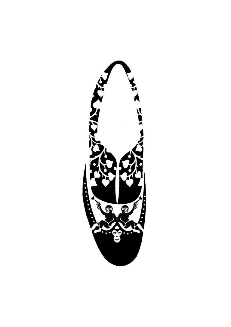 Bendix send me the greatest of explanations to accompany his design. The shoe was an ironic tribute to 2016, the Chinese year of the monkey. It was also a statement against terror and violence, hence the hearts coming out of the monkey's guns. The shoe also represented a new male 'antitype': a strong, yet sensitive man who's original, straightforward, free, intuitive, open, funny, playful, elegant, influential and loving. It symbolised 'The Power of Love' and juxtaposes the presence of terror and violence with "love even more!".