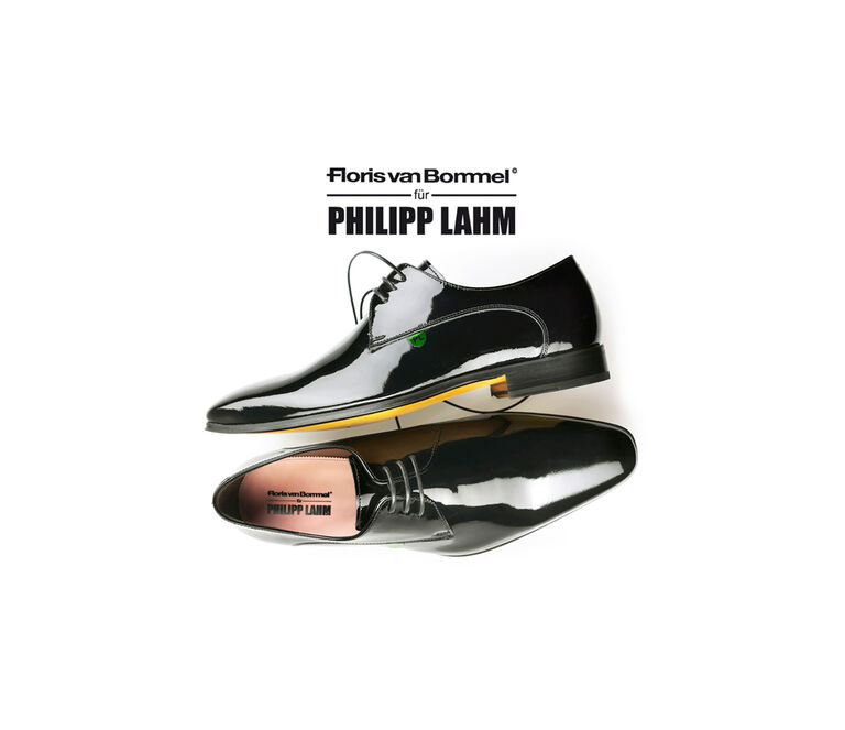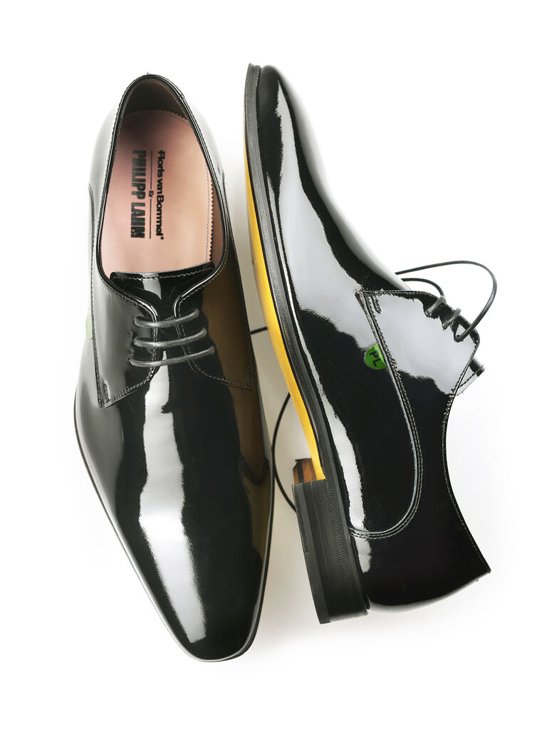 One of those sensitive topics was the AIDS situation in Africa. At Philipp’s request, the entire earnings of the cooperation were donated to the German AIDS foundation. For that reason, we presented the shoe we made for Philipp on December 1st, World AIDS Day. Because of the launch date being in December, we opted for a sleek black patent leather shoe, perfect for the holiday season."