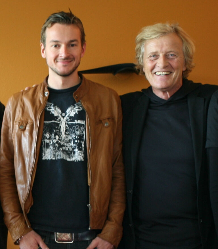 I've met Rutger a couple of times during our campaign and that was always an impressive experience. One time, he even visited our factory in Moergestel. As we walked out of the building to get lunch, he insisted to take a selfie. He drew my brother and myself in close, said 'smile', and took the snap. You’ll find the proof of this moment below. The most special encounter I had with him was shortly before the big press event in Amsterdam. We had agreed to meet around the corner from the Tuschinsky theatre, after which I would escort him inside. Upon meeting him however, he mentioned that he was hungry. He knew of a cafe that served good cheese croquettes. We dashed through some alleyways, Rutger went into the tiniest little cafe, and as a seasoned celebrity instantly disappeared behind a stone column. There we sat, at the tiniest table. As I was bumping knees with the great Rutger Hauer, watching him try not to burn his mouth on the scalding hot cheese croquettes, I pinched myself and took a mental picture."