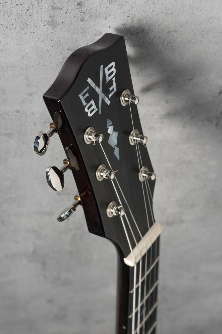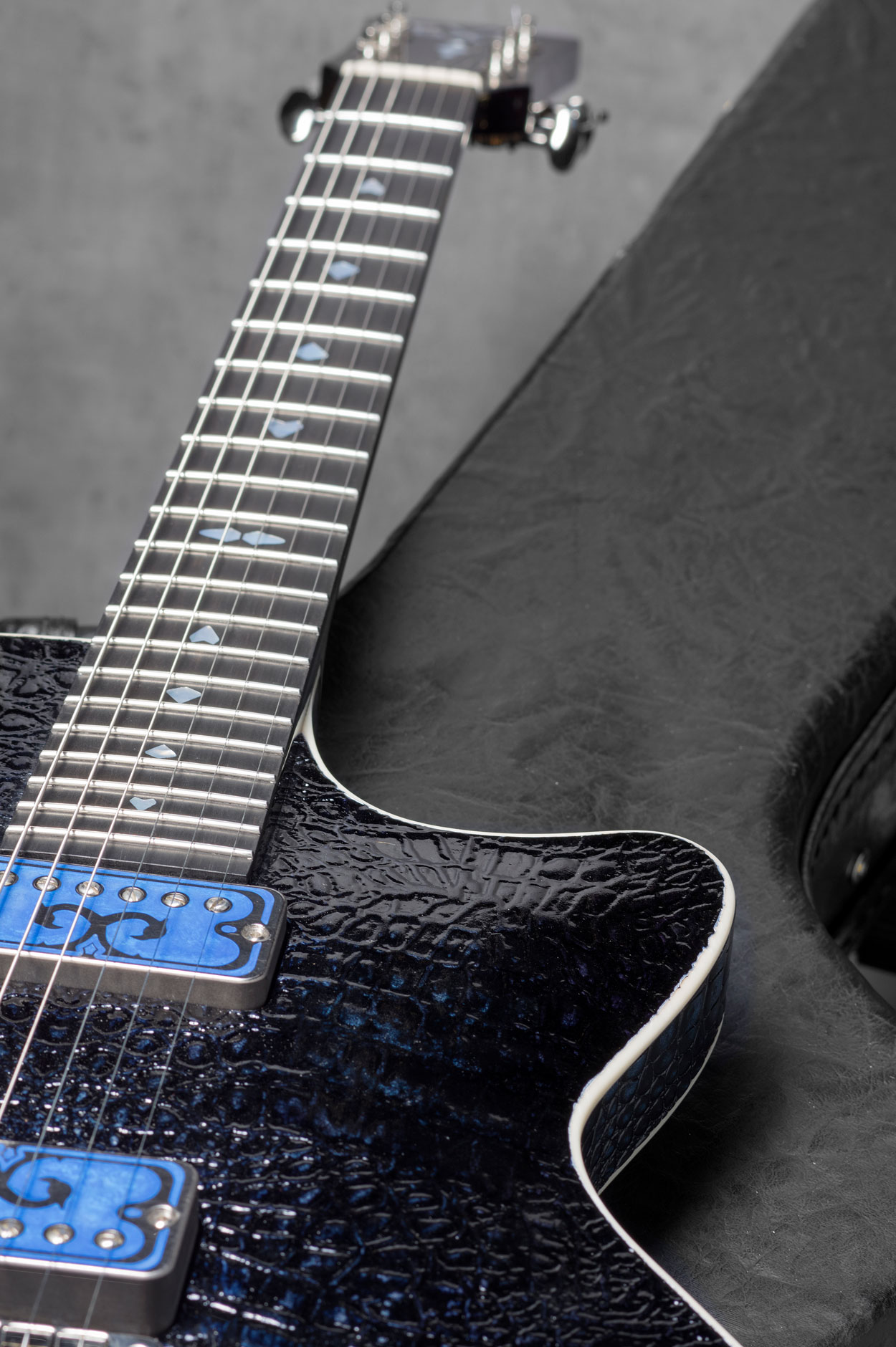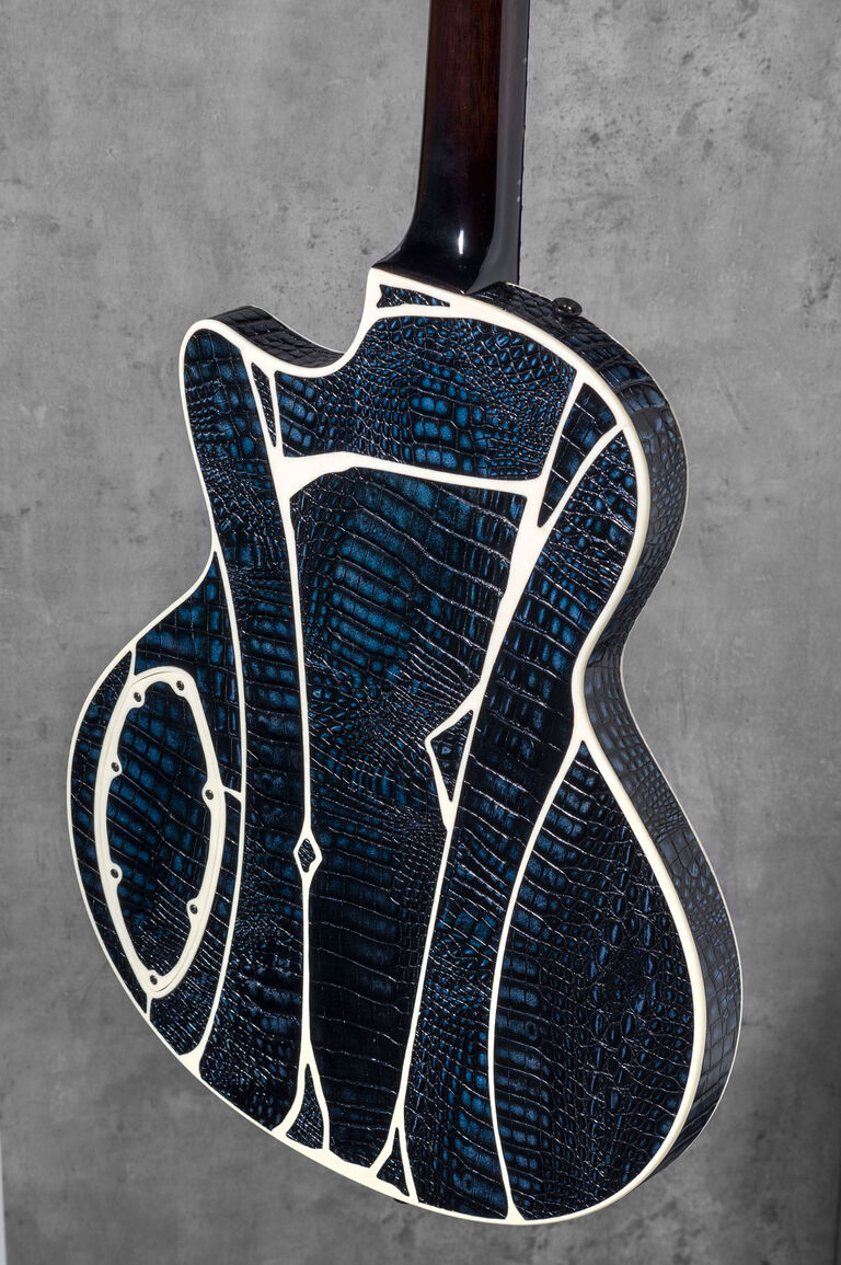 Theo called his guitar the 'Memphis 'T FVB'. It's a unique custom built hollow-body Thinline guitar. The shape of the back with the inlaid leather is totally unique. The body is made out of solid maple, and the wood on the front is treated in such a way that it mimics the croco print of the leather on the side and back. Various layers of varnish give the wood the same metallic blue look as the leather. The housings of the elements are custom built. The wooden parts are completely made by hand. The back and side of the guitar is done in cedar wood from Madagascar.
