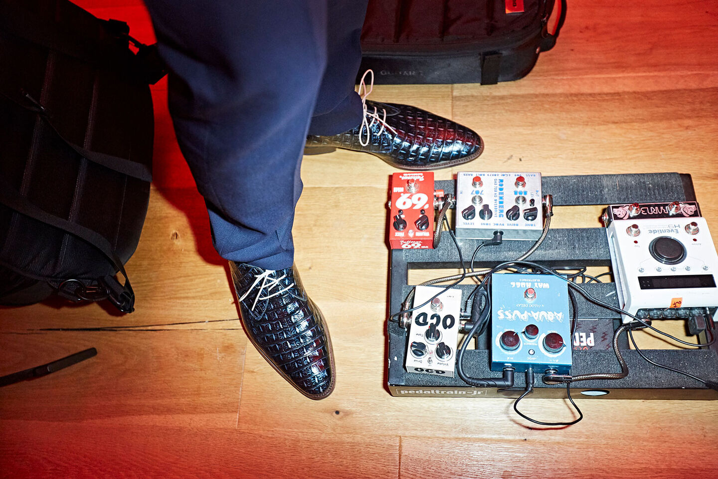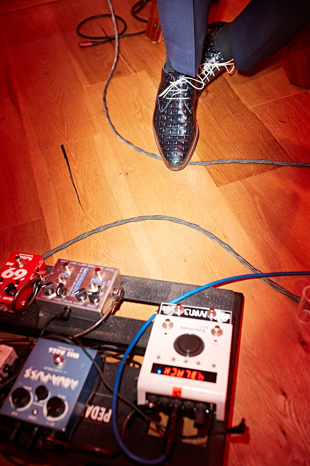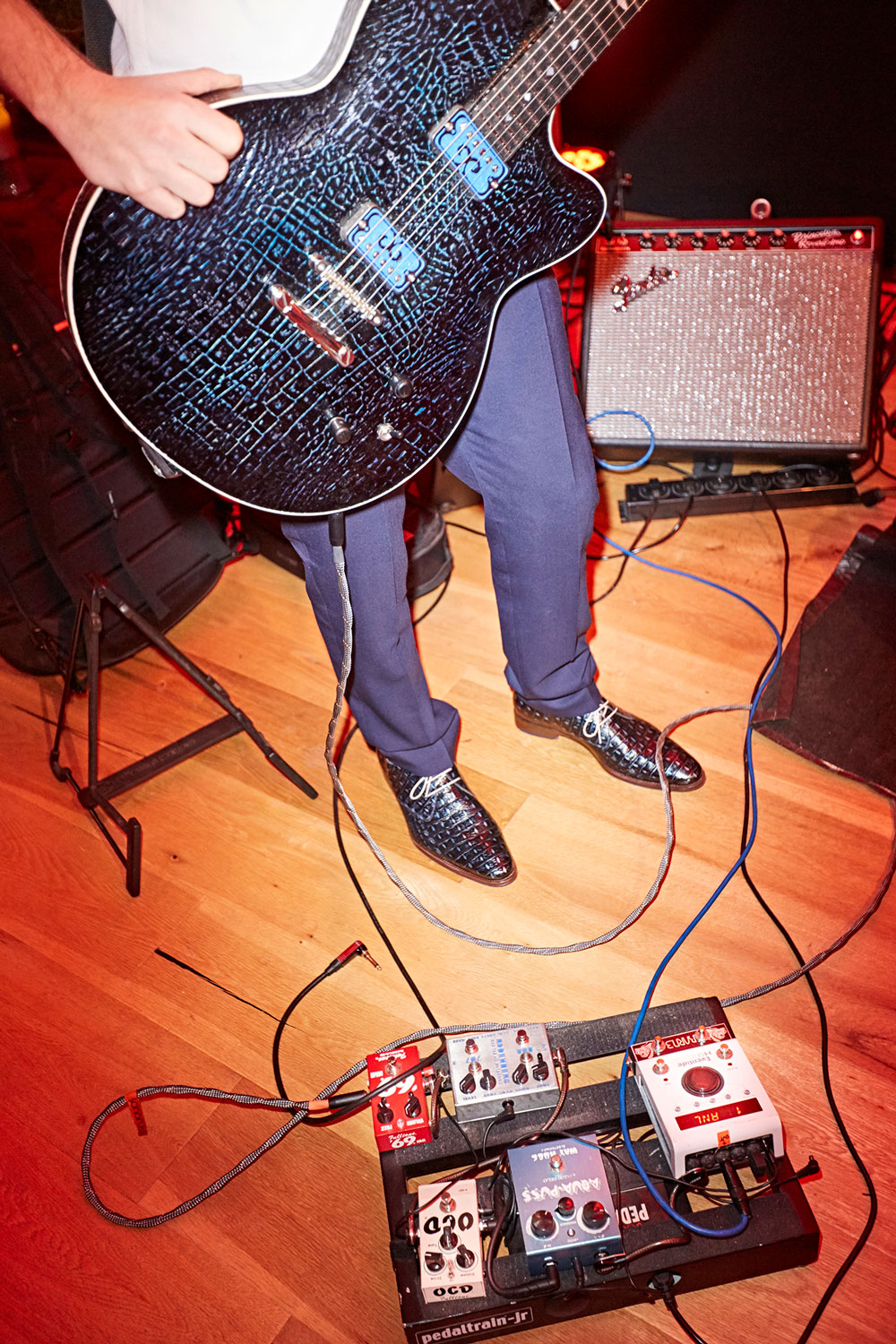 Theo called his guitar the 'Memphis 'T FVB'. It's a unique custom built hollow-body Thinline guitar. The shape of the back with the inlaid leather is totally unique. The body is made out of solid maple, and the wood on the front is treated in such a way that it mimics the croco print of the leather on the side and back. Various layers of varnish give the wood the same metallic blue look as the leather. The housings of the elements are custom built. The wooden parts are completely made by hand. The back and side of the guitar is done in cedar wood from Madagascar.
