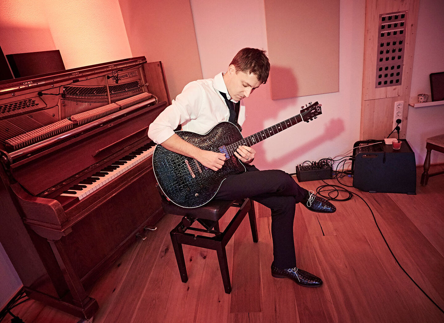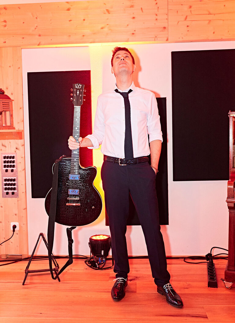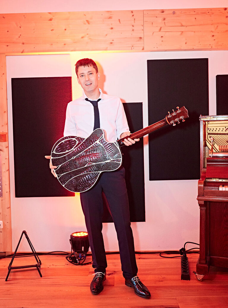 Pretty soon after discussing the idea for the guitar, Theo and I decided to make not one, but two guitars. One of them would travel from brand store to brand store as a true icon, and one would be actually played by a young talent. We took a long time finding a purist player who could muster out every single note Theo put into this guitar, and our search ended with Daniel Stelter, a young and ambitious jazz guitarist from Germany. We gave him the guitar to support him in his musical career."
