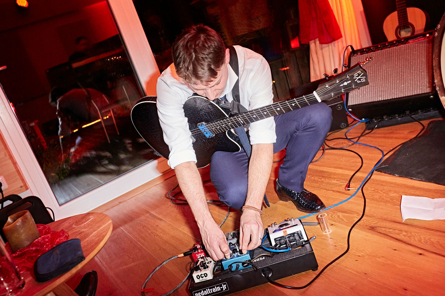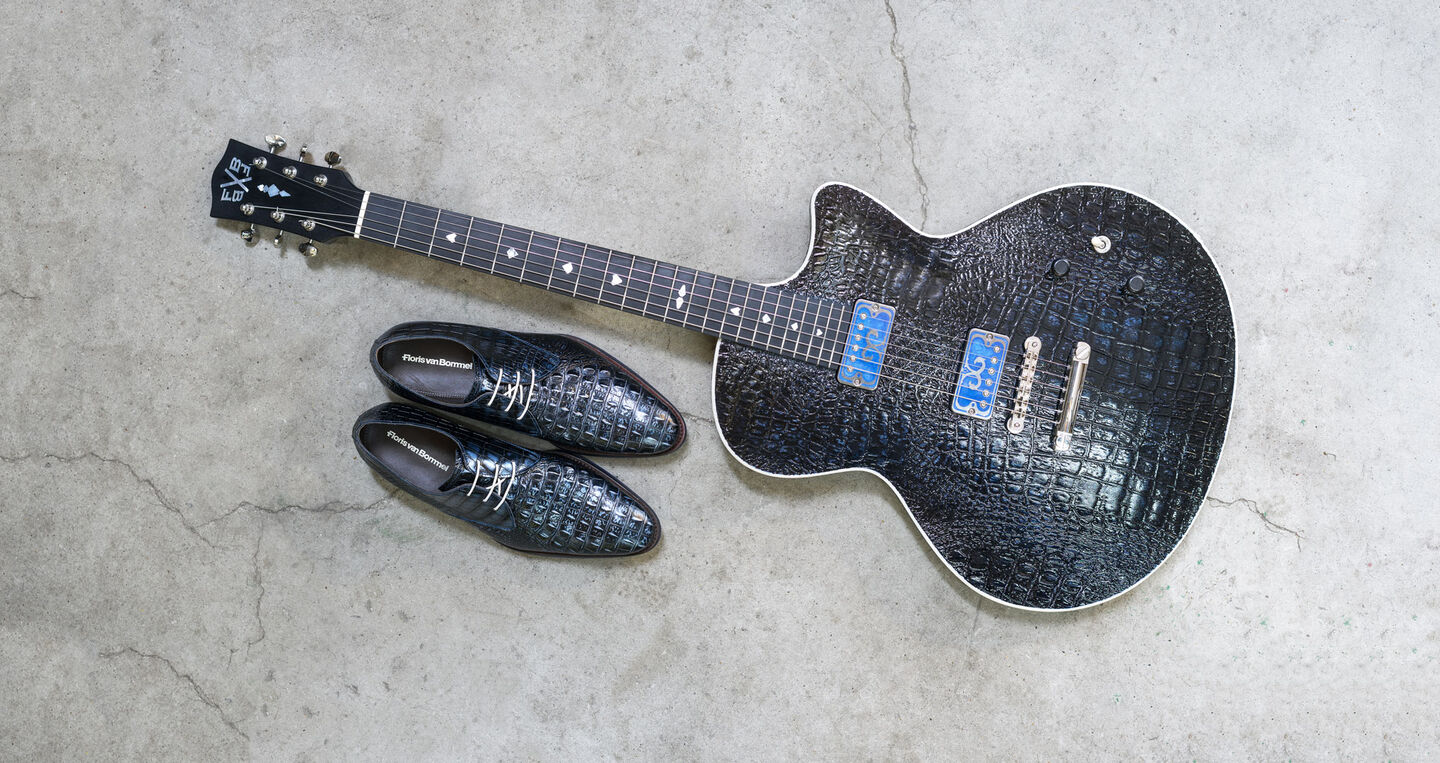 Floris: ”The idea for this project came about in just 2 minutes, but executing it took 2 years. Theo approached us with the idea of inlaying the back of a guitar with leather. I liked that idea, especially if we would make shoes out of that same leather.