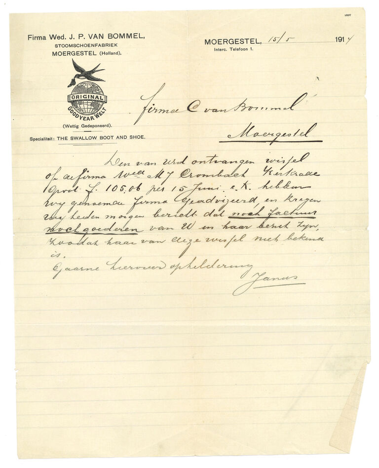 (Image below: A letterhead from 1914 mentions the new phone number of Schoenfabriek van Bommel for the first time: Phone number 1.)