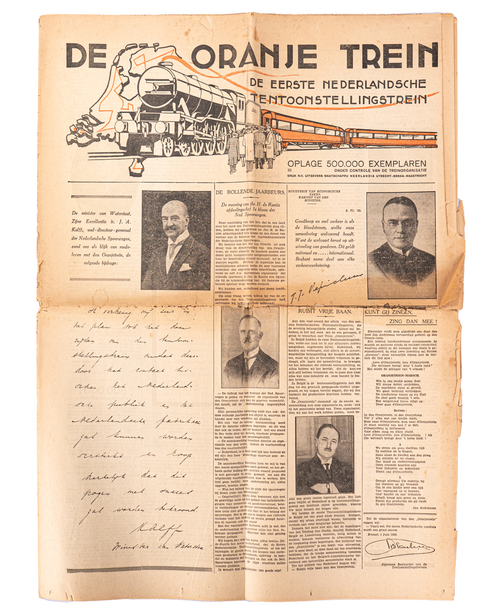 Quote from the Oranjekrant: “In 1933, the Oranjetrein, featuring the representatives of Dutch industry and trade, arrived at the station in Utrecht. It was the first Dutch Exhibition Train, which, following the example of other countries, started a quarterly steam trip from there through our country, to show the Netherlands the importance of its own industry and trade.”