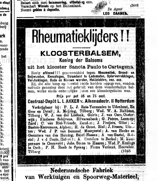 In the grocery shop, Van Bommel sold groceries and other daily necessities. We found ads in old regional newspapers in which Van Bommel advertised manufactured goods (textile goods), colonial goods (spices) and a “Miraculous Cloister Balm”. According to the ad, the cloister balm alleviated “rheumatism, burns and cuts, bruises, stiffness, muscle strains, old and new wounds, skin diseases, and so on and so forth”.