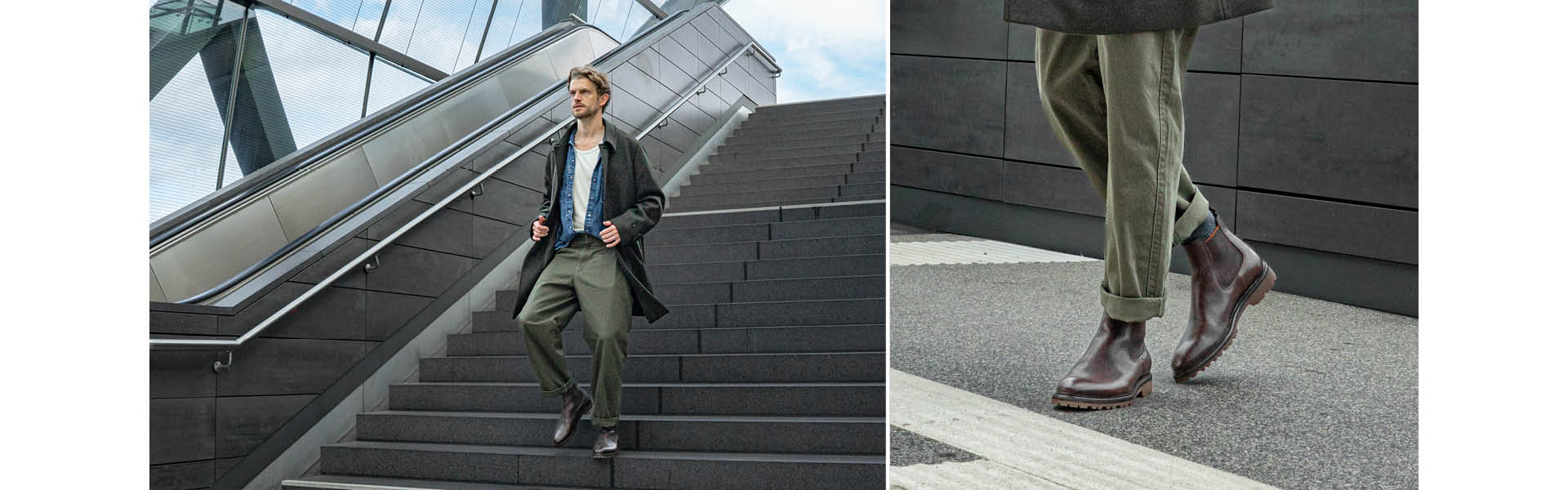 Jens shows how he styles the dark brown "Noppi" and orange "De Treener" sneakers, a classic cognac lace shoe, and a casual Chelsea boot from our winter collection.