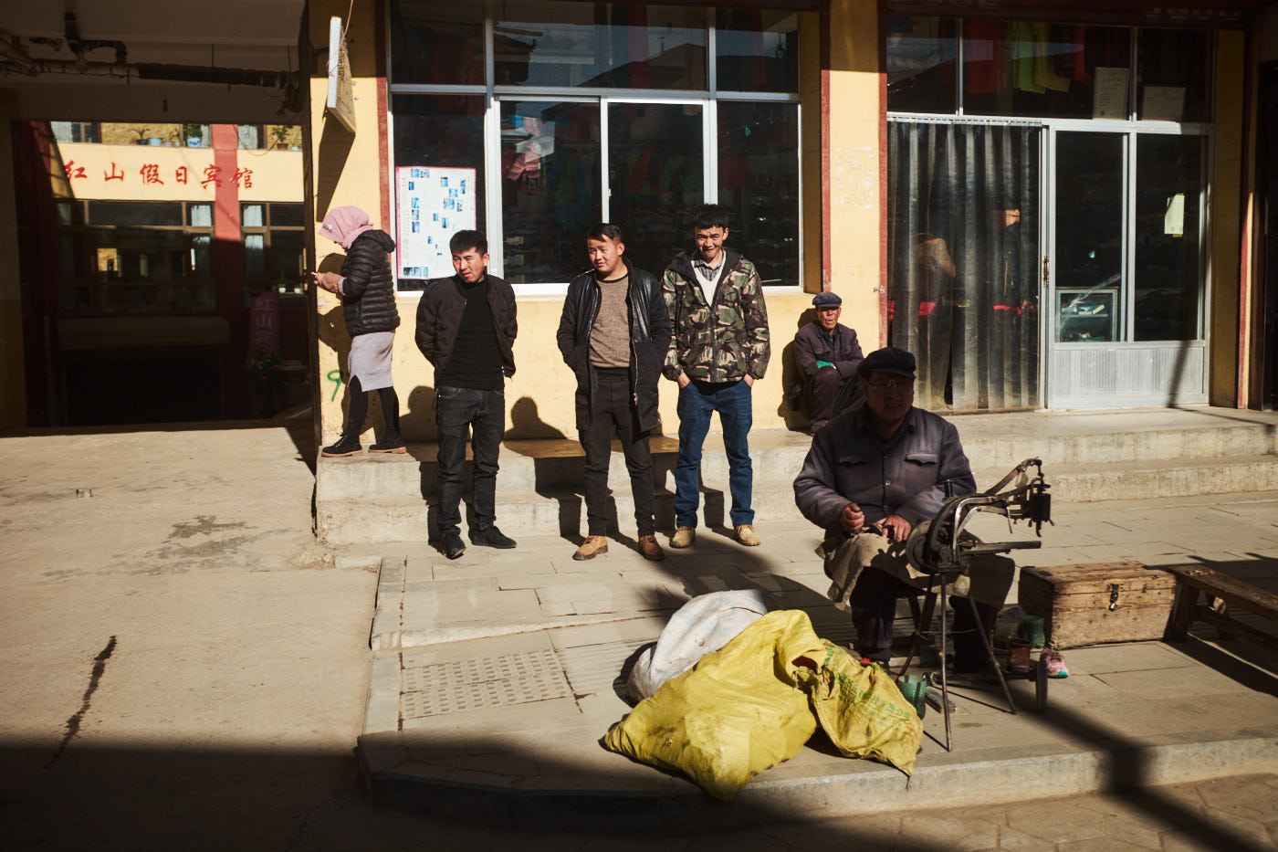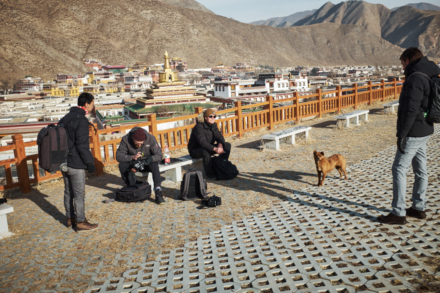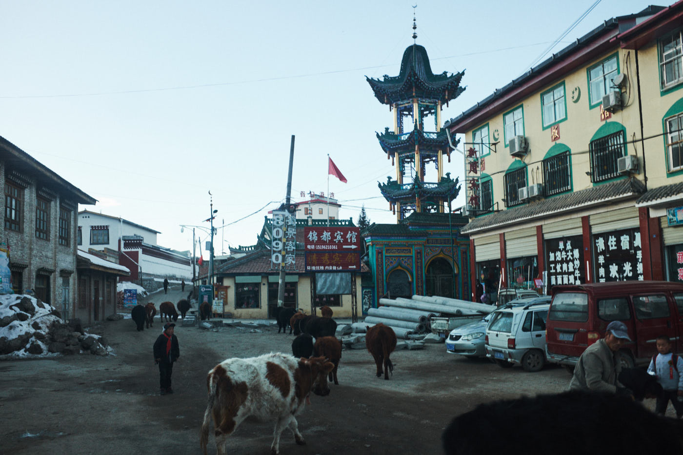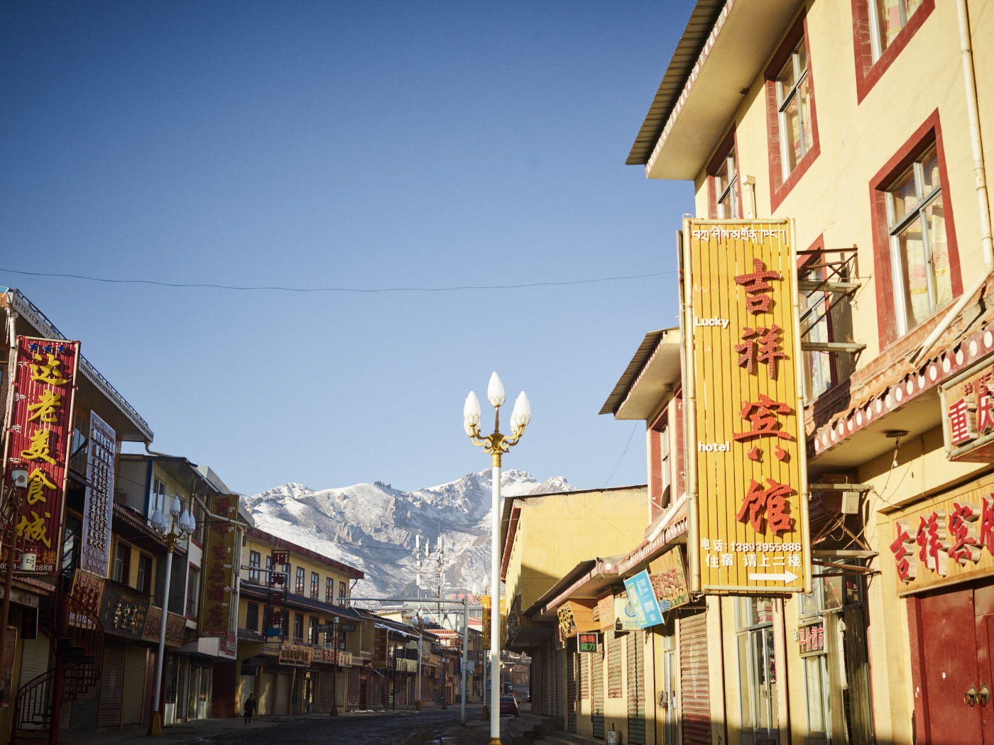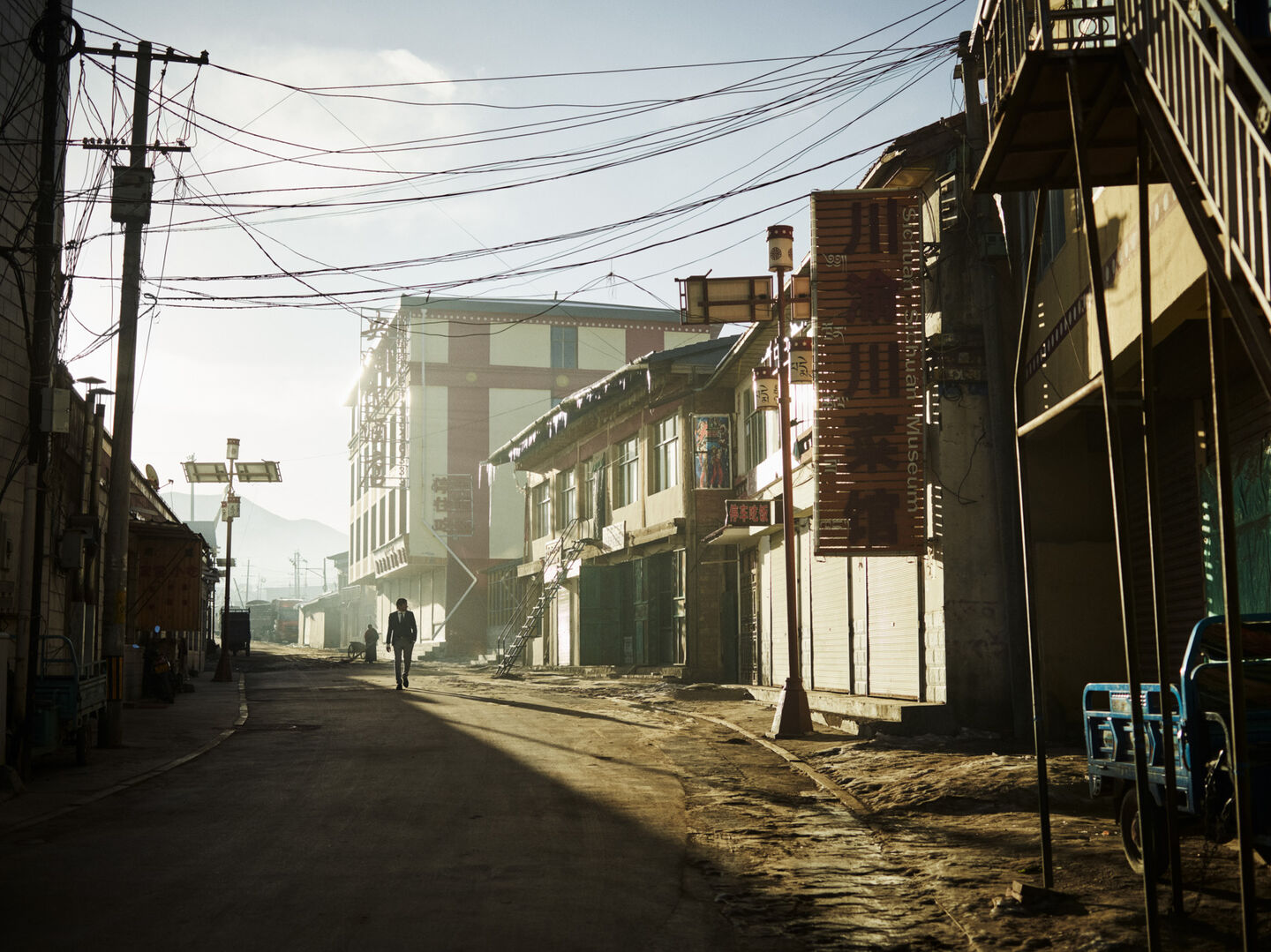 De foto die we uiteindelijk als advertentie hebben gebruikt is bij het krieken van de dag genomen in Lansu. Dit dorpje ligt volgens de Chinezen in China, maar volgens de bewoners van het dorpje zelf in Tibet. Ik had het idee dat ik op een filmset voor een Chinese/Tibetaanse western rondliep. Geen spaghetti western, maar een bami western. Het leuke van onze manier van werken is dat we nooit weten waar we dé foto gaan maken. We plannen zo goed mogelijk een roadtrip en dan is het terplekke 100% improviseren. We laten de magische momentjes op ons afkomen. Deze lege straat met in de achtergrond een berg die lekker van het ochtendzonnetje aan het genieten was is er zo eentje.