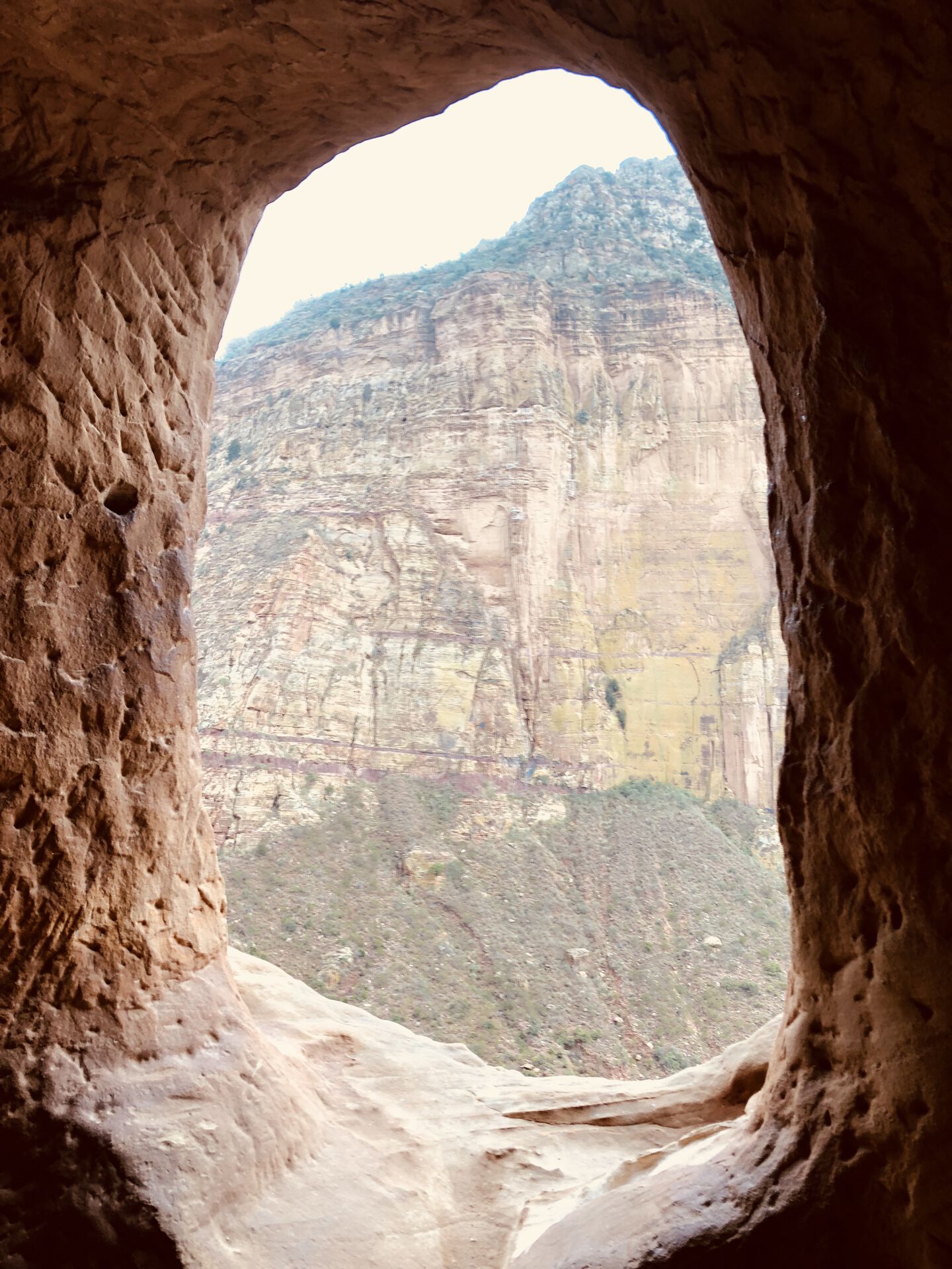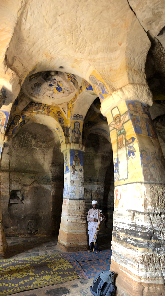 In het holletje zit een klein houten deurtje naar een kerkje dat nog dieper in de rots is uitgehakt. Dat was de hele reden van de klim. Het deurtje gaat open en we krijgen een rondleiding van de priester. Het is prachtig. Onze berggids vertelt over de muurschilderingen, ‘dat zijn de 12 apostelen’. Ik denk bij mezelf: ‘Goedzo Prittstift, babbel jij ff lekker over je apostelen, dan ga ik even bedenken hoe ik deze ruimte in zal richten WANT IK ZIT HIER VOOR DE REST VAN MIJN LEVEN VAST!’. Alles draaide nog steeds. Ik heb pudding in m'n benen en ben er van overtuigd dat ik door m'n benen zak als ik die richel weer op ga. Terug in het holletje kijk ik door het gapende gat naar buiten. Dit kan niet. De richel zie je van binnenuit niet, er is alleen maar verte, diepte en hoogte buiten. Ik schuif op m’n kont richting het gat en kijk voorzichtig naar de richel. Tot mijn vreugde zie ik dat die toch geen 30 cm is maar zeker 80 cm. Het geeft me net genoeg rust om de terugtocht aan te durven. Terwijl ik van binnen huil en aan schoenen denk (da’s belangrijk hè mensen! In schoenen vind je rust en steun! Altijd.) schuifel ik als eerste naar buiten.