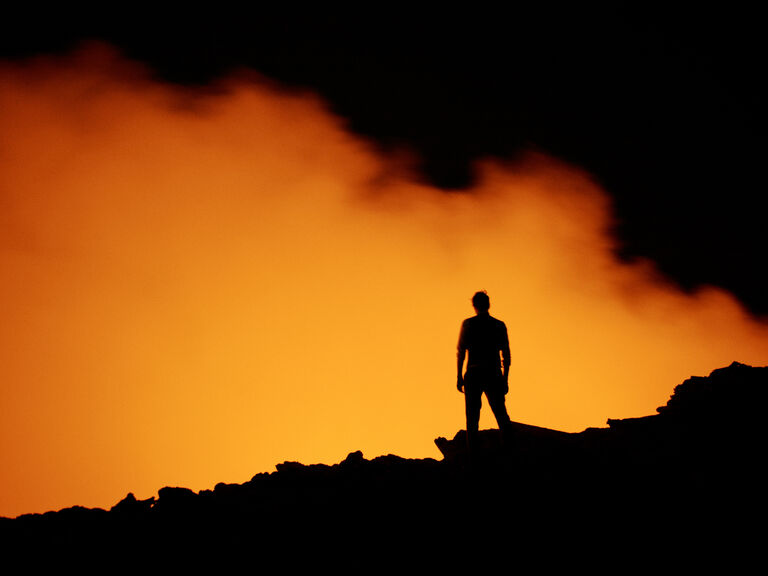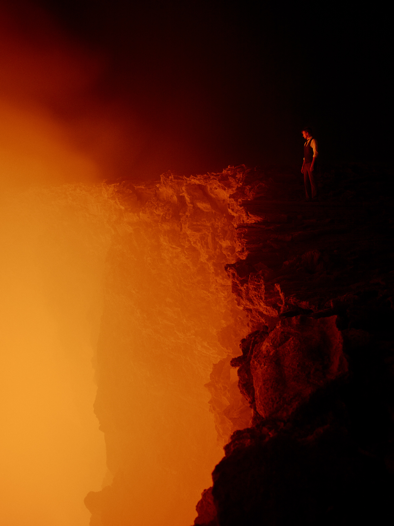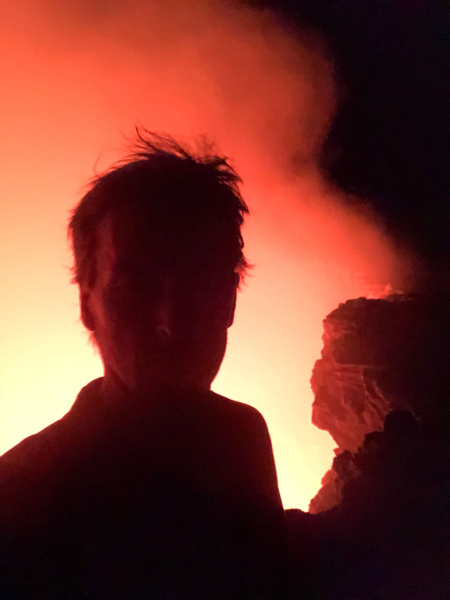 1 juni, Afar Ethiopie. Tot nu toe waren we op de hoogvlakte van Ethiopië. Dat is het ontwikkelde deel van het land met een mild klimaat. We reizen nu door naar de laagvlakte, dat is het 'houten-hutjes-deel' van het land met officieel het heetste klimaat op aarde. We gaan in het donker (want overdag is het te warm) een actieve vulkaan beklimmen.. Goed plan natuurlijk! Na een heftige hike van meer dan 10 km staan we rond 23.00 uur ’s avonds boven op de vulkaan. Ik sta op minder dan een halve meter van de brokkelige rand omlaag de krater in te koekeloeren terwijl het waait in de richting van het gat. Niet heel erg arbo-proof zakmarzegge. Ongeveer 50 meter lager in de krater zien we door de zwaveldampen heen waanzinnige ontploffingen van lava. Het lavameer maakt een zelfde soort geluid als een wilde zee, maar dan een paar octaven hoger. Een krankzinnige ervaring. Nadat ik dat ook weer overleefd heb, trek ik - in het kamp wat verderop - m’n nette pak aan en we maken een paar waanzinnige foto’s en opnames bij het lavameer. We overnachten boven op de vulkaan in de buitenlucht tussen allerlei kruipende beesten. ‘If you have to go to the toilet, you can go behind the camels!’