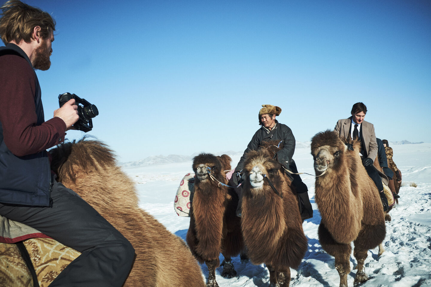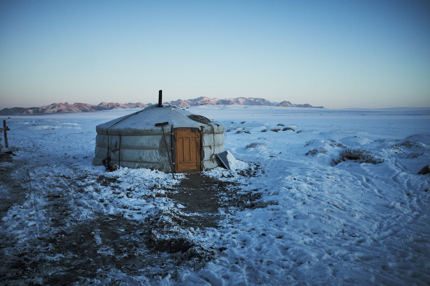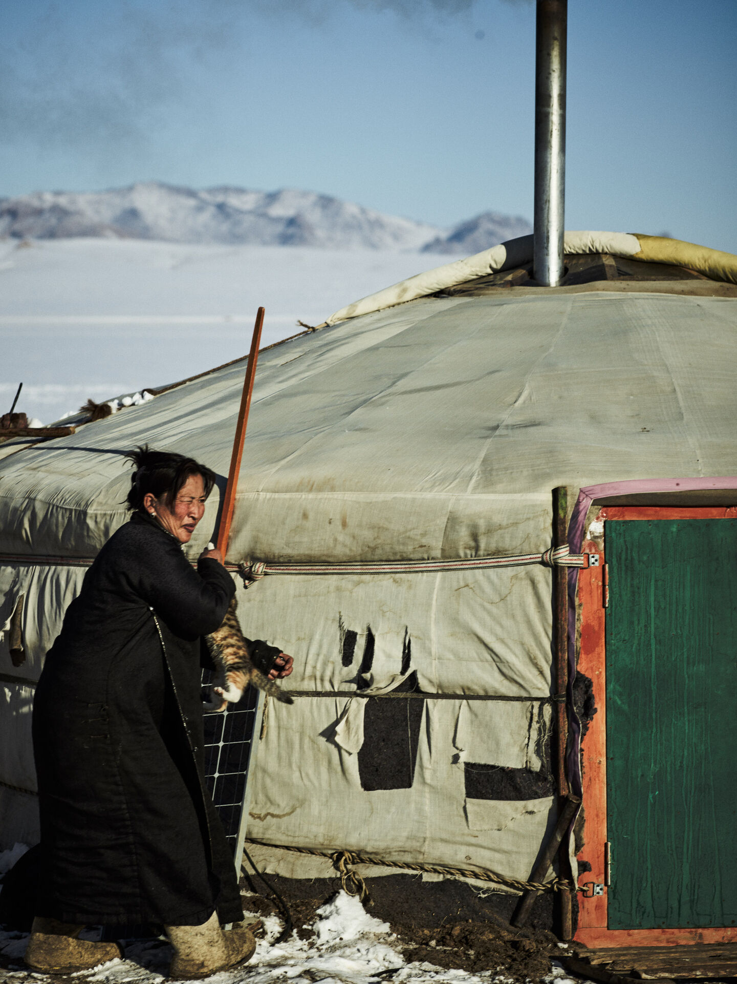 Een paar nachten slapen we bij nomadische boerenfamilies in hun ger. Een ger is een traditionele ronde tent. In onze briefing stond, met uitroeptekens, dat we in tenten zouden slapen en dat we een slaapzak moesten meenemen die tot -20 graden kon. Onze dames van de productie wisten niet dat zo’n ger méga geïsoleerd is. Onze superaardige Mongoolse gastvrouw kwam ’s nachts ook nog eens om de anderhalf uur met gedroogde kamelenpoep het kacheltje lekker opstoken. Het kwik steeg tot ongekende hoogte in de tent. Gelukkig was er buiten voldoende kou. Na de temperaturen in Alaska dacht ik dat ik het ergste wel mee had gemaakt. Dat bleek toch niet zo te zijn. De -40 in Alaska was kinderspel vergeleken bij de -20 MET WIND in Mongolië. Zodra het maar een beetje waaide was het onmogelijk om foto’s te maken. Elk ontbloot stukje huid bevroor direct.