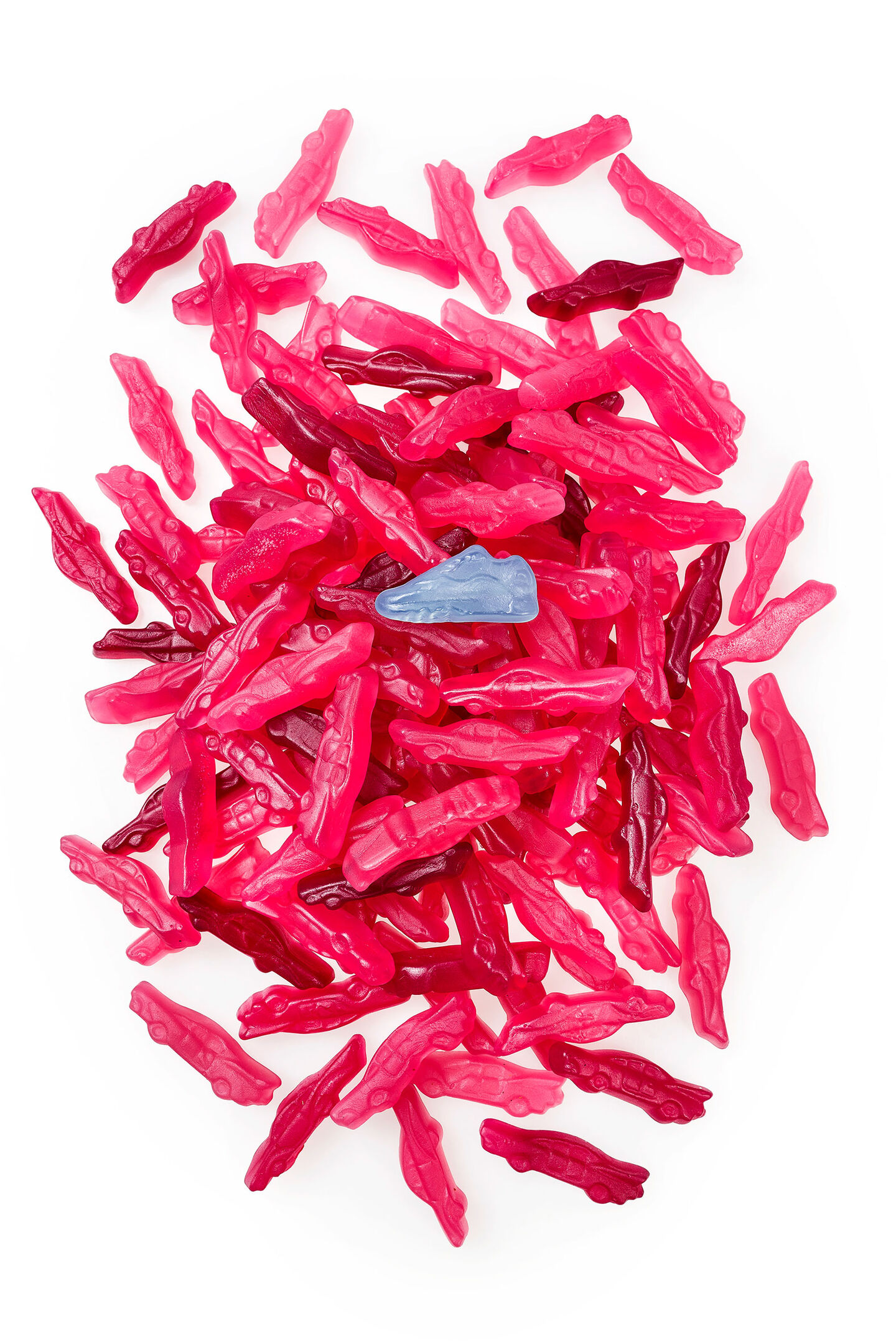 Het originele plan was om onze sneakertjes blauw te maken en een andere smaak te geven. Dat was nog leuker geweest dan roze sneakers tussen de ook al roze cadillacs. Uiteindelijk kon dat niet doorgaan omdat het Roze Cadillac doosje dan technisch gezien een nieuw product zou zijn. Het zou dan niet meer als standaard Roze cadillacs uitgeleverd kunnen worden aan de supermarkten, tankstation en drogisten enzo. We hebben toen wel een kaziljoen samplezakjes gemaakt waar wél de blauwe sneakertjes in zaten. Ik mocht voor die blauwe snoepjes zelf de smaak uitkiezen. Ik heb daar voor het persbericht toen dit stukje tekst over geschreven: