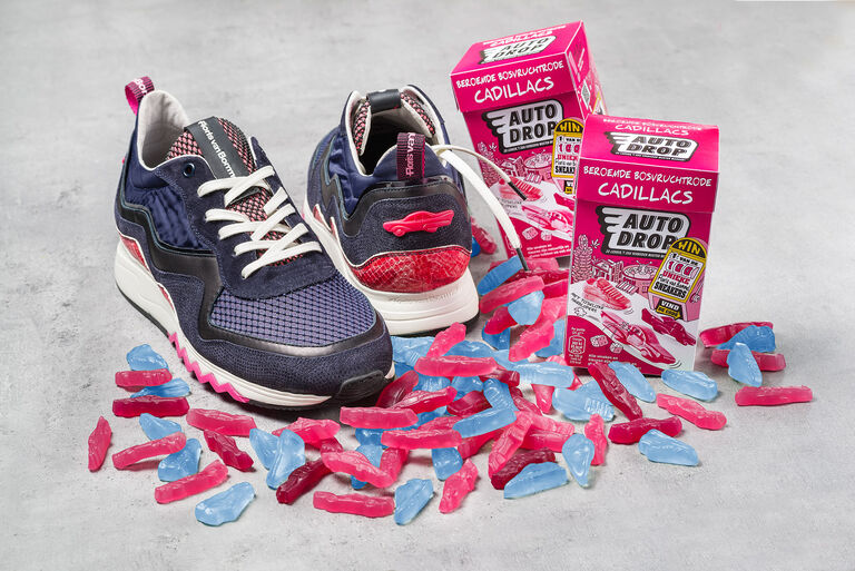 Floris: “In het voorjaar van 2019 zaten er ongeveer 2 maanden lang roze snoepsneakers tussen de roze Cadillacs van Autodrop. In alle doosjes, en ik heb toen geleerd dat Nederland er in een paar weken echt flink wat doosjes doorheen kauwt, zaten onze sneakertjes. Die snoepsneaker was gemodelleerd naar een real life limited edition ‘Floris van Bommel & Autodrop sneaker’. Uiteindelijk werd dat zo’n mooie uitgebreide campagne met allerlei winacties en heeeeeeel veel snoep.