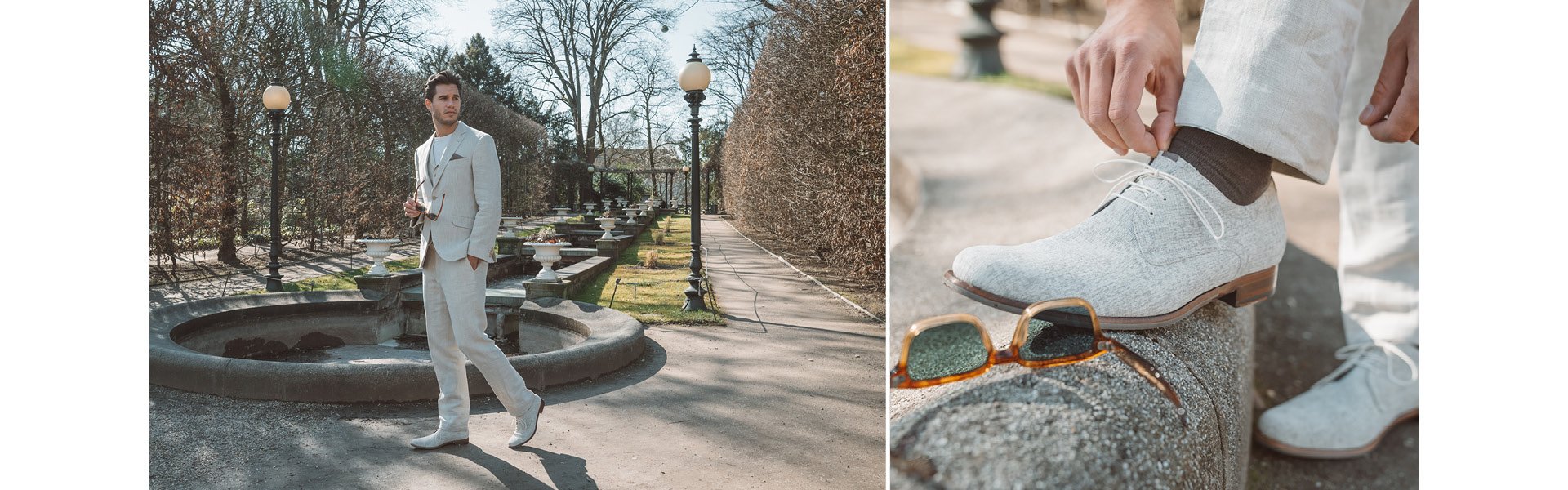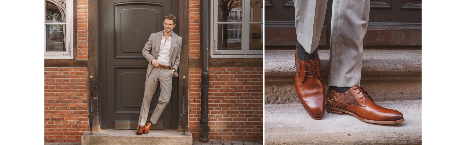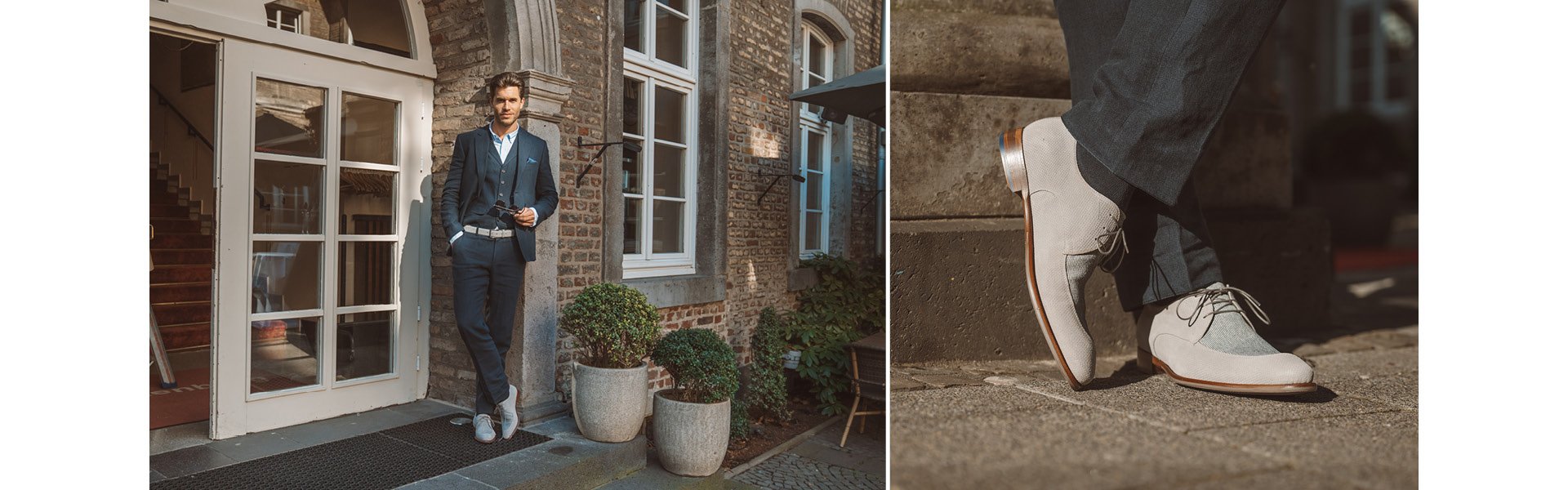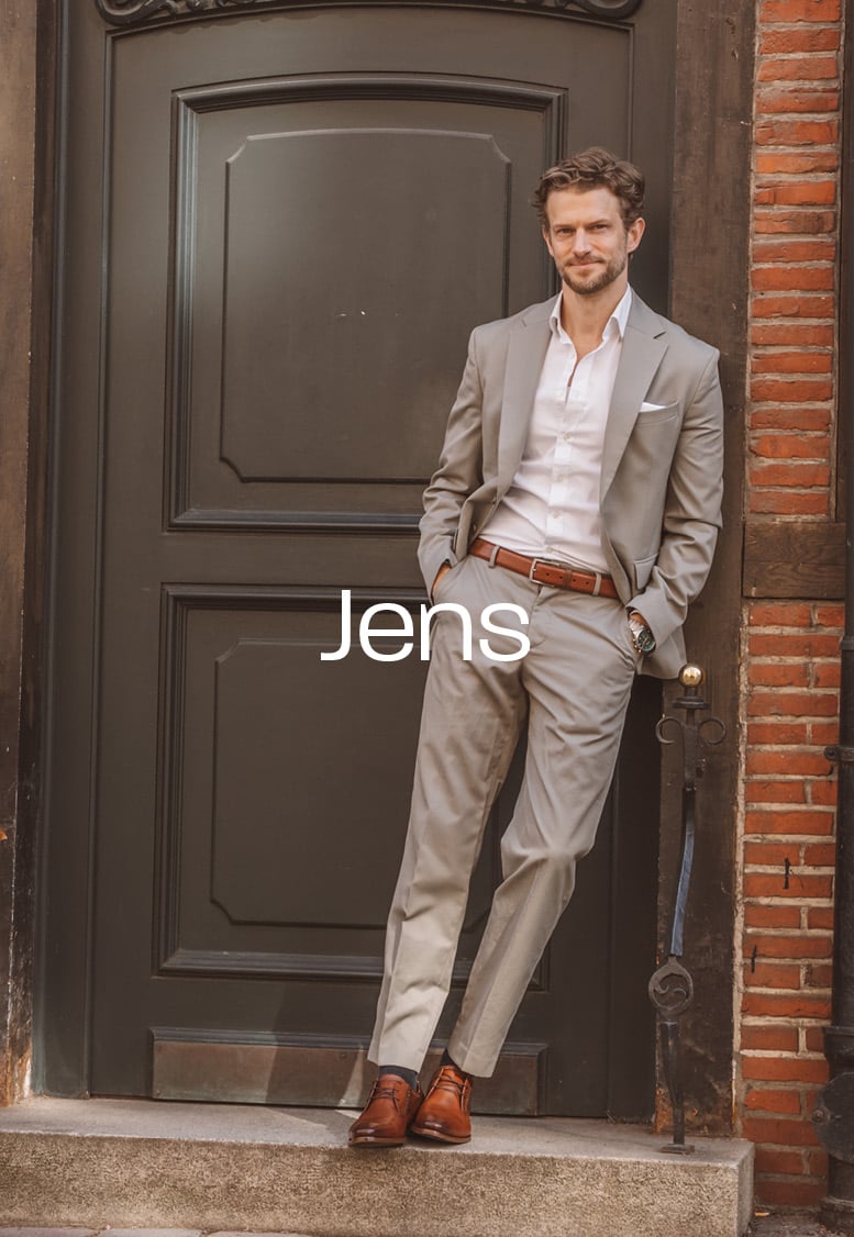 Jens laat zien hoe hij de lichtgrijze mocassin, een klassieke zwarte kalfsleren brogue, een cognac derby en de populaire De Zaler uit onze zomercollectie stijlt.